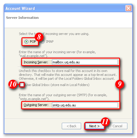 | 9)Enter 'mail.griffons.com' in the 'Incoming Server' field, and 'smtp.griffons.com' in the 'Outgoing Server' field. |