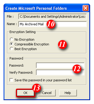 12)If you would like to place a password on your personal folder enter the details here (Note: ITS does not have the ability to reset this password, so you should only protect this folder if you feel it is absolutely necessary for security reasons. If you forget your password you will NOT be able to access your personal folders)