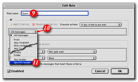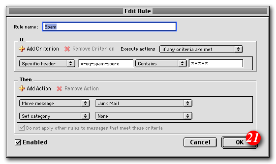 For example, if you wanted to consider anything with a score of 3 or more to be spam, the rule would look like: 'X-SpamDetect: ***'. Decreasing the number of asterisks will result in classifying more e-mails as spam. You may need to check your spam folder more carefully for non-spam e-mails that might have been classified as spam. If you wanted to rate anything with a score of 8 or greater as spam, the rule would look like: 'X-SpamDetect: ********'. Increasing the number of asterisks may result in fewer filtered e-mails being classified as spam and more potential spam staying in your Inbox.
